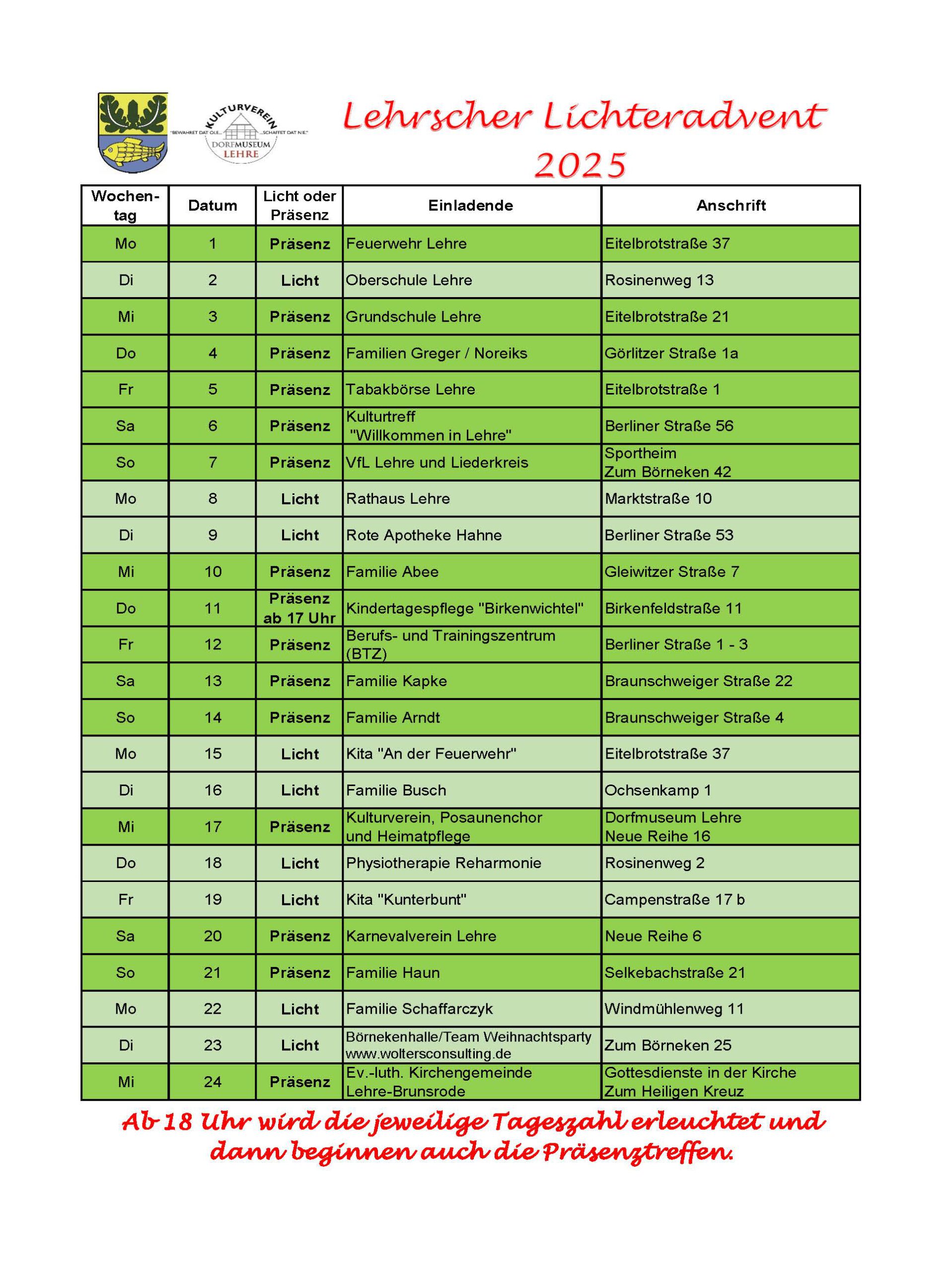 In Lehre soll an jedem Abend im Dezember um 18 Uhr eine neue Zahl in diesem besonderen Adventskalender erstrahlen. Dabei können die Teilnehmenden selbst entscheiden, ob sie die Zahl zum Strahlen bringen (Licht) und ob zusätzlich ein Umtrunk oder eine kleine Veranstaltung angeboten wird. Dies soll auch den Druck einer Bewirtung nehmen. Alle machen es einfach so, wie sie es mögen. Die erleuchteten Zahlen sollen dann jeweils bis zum Jahresende so erhalten bleiben. Beispiel gefällig? Der Kulturverein plant am Mittwoch, 17. Dezember, am Dorfmuseum wieder den gemütlichen Abend mit dem Posaunenchor Lehre. Dabei wird die Zahl „17“ erleuchtet, der Posaunenchor stimmt musikalisch auf Weihnachten ein und es gibt auch Glühwein, Kinderpunsch und einige Leckereien.